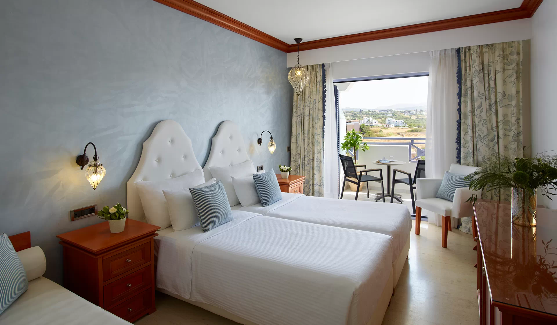 Die 22 m² großen Doppelzimmer bieten modernen Komfort und sind im mediterranen Stil mit warmen, dekorativen Akzenten gestaltet. Sie umfassen einen Wohn-/Schlafbereich, ein modernes Bad, einen Safe, ein TV-Gerät, eine Klimaanlage sowie Balkon oder Terrasse. Sie befinden sich im Hauptgebäude.