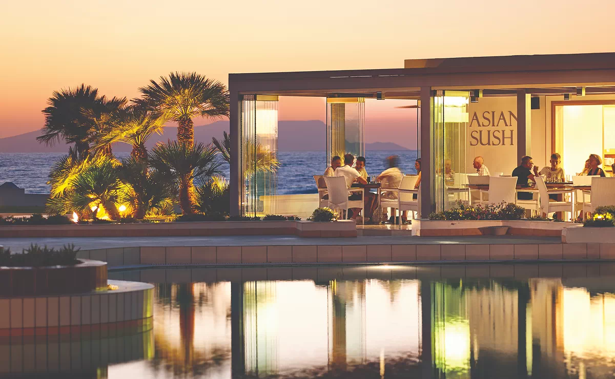 Erleben Sie asiatische Spezialitäten mit Blick auf das Kretische Meer. Hier erwarten Sie feine Sushi-Kreationen wie Maki, Nigiri, Sashimi und Chirashi sowie weitere Spezialitäten der asiatischen Küche. Ein Fest für die Sinne!